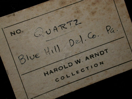 | Description: | Compact mass of interconnected translucent quartz crystals with brown limonite mixed in throughout. The quartz has a greenish-gray color that this site has been know for since the 1850s. Ex. Harold Arndt, former president of the Delaware County Institute of Science |