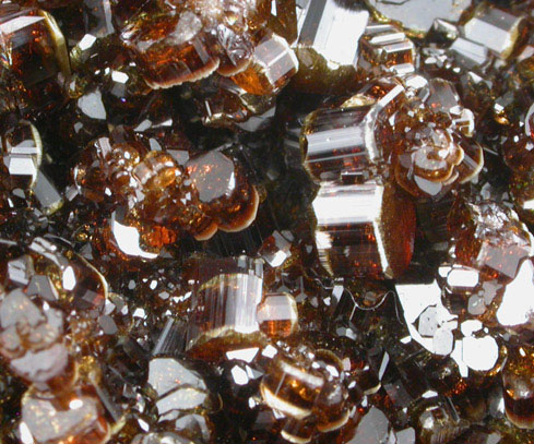 | Description: | Astounding beautiful when viewed under magnification, this cluster is brilliantly lustrous, transparent brown vesuvianite crystals with yellow termination zones. |