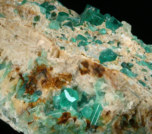 | Description: | Flat plate of tan-colored quartz + pyrite matrix with many transparent emerald crystals, the green gem variety of the mineral species beryl. The emerald crystals are in two areas and I am tempted to split the specimen in two. Has great color and luster. Ex. Murchison, collected ca. 1950 |