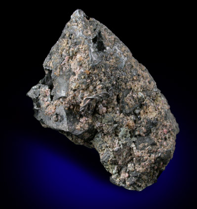 | Description: | Rare native silver pseudomorph after a steep pyramidal acanthite crystal 20 mm high. The silver is the outer visible surface and the core has entirely altered to black silver sulfides and sulfosalts leaving the original acanthite form still intact. Ex. Don Olson |