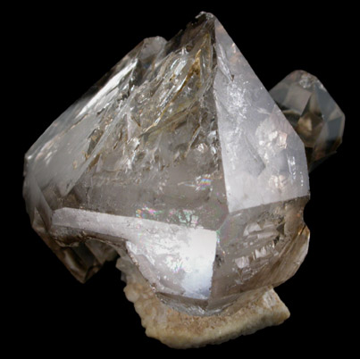 | Description: | Several smoky quartz crystals on white albite matrix. The small crystals are water-clear, the large crystal has transparent smoky quartz over a milky quartz core with several solution cavities on the surfaces. The terminations are chipped. Ex. R. Fitton collection |