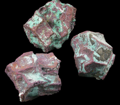 | Description: | Three native copper pseudomorphs after pseudohexagonal aragonite crystals up to 8 mm across with greenish copper-oxide patina. |