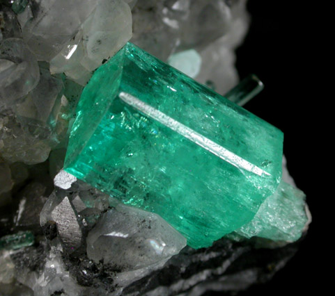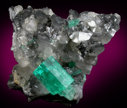 | Description: | Six emerald crystals (the green gem variety of beryl) intergrown with translucent gray calcite crystals. The main emerald crystal has deep color, glassy crystal faces and is gem-grade in the termination zone and could produce a 4 mm gemstone. |