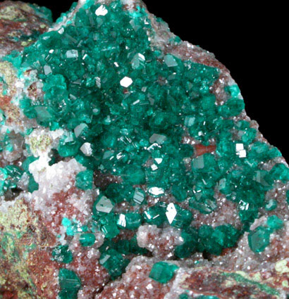 | Description: | Lustrous transparent emerald-green dioptase crystals scattered over calcite-rich matrix and lining small cavities. Excellent color and clarity. |