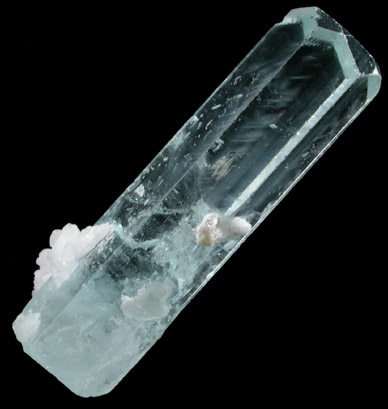 | Description: | Glassy pale-blue aquamarine variety of beryl crystal with white albite crystals attached on one side near the base. The termination has secondary faces all around. Note the oriented silky inclusions running through the center in a spiral pattern. |
