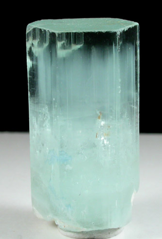 | Description: | Transparent aquamarine beryl crystal with glassy crystal faces and flat basal pinacoid termination. Note the internal phantom zone composed of thin, parallel tubes that resulted from interrupted growth of the termination face. |