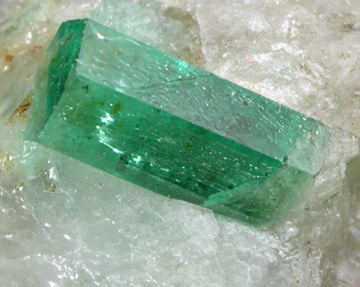 | Description: | Gemmy green hexagonal emerald crystal (the green gem variety of beryl) in milky calcite matrix. The emerald crystal has good color and clarity. |