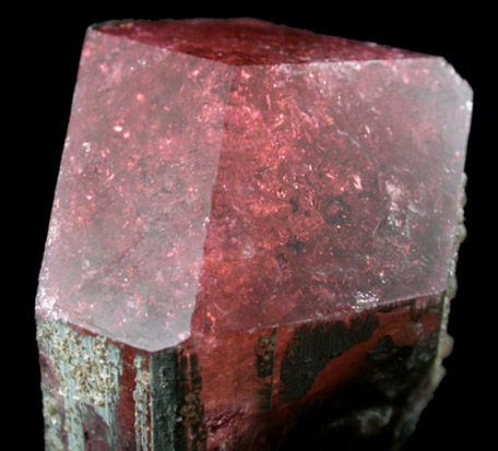 | Description: | Translucent pink elbaite tourmaline crystal with shallow pyramidal termination and several faces partially coated with gray muscovite microcrystals. The termination has sparkling internal reflections that resemble metallic inclusions. |