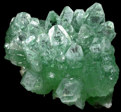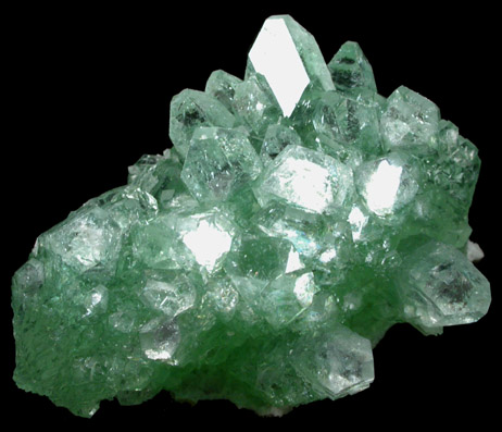 | Description: | Large cluster of lustrous transparent vivid-green apophyllite crystals on a thin crust of colorless quartz microcrystals. The high refractive index and pyramidal terminations are highly reflective making this specimen very attractive. |