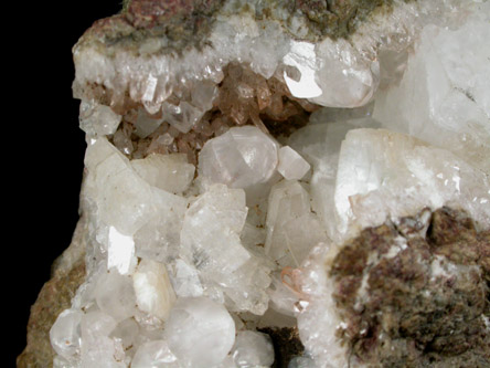 | Description: | Several cavities filled with four colorless minerals: apophyllite up to 20 mm, quartz crystals up to 3 mm, pseudocubic calcite up to 6 mm and pearly heulandite crystals up to 10 mm across. The old label list native copper, but is probably hematite. Ex. Upsala College; collected by Craven |