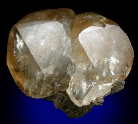 | Description: | Two twinned pairs of golden calcite crystals on brown limestone matrix. Each calcite pair is twinned through the middle, one with the twin plane biased to one side. A very attractive specimen from a famous mineralogist's collection. Ex. D. London collection #L210 |