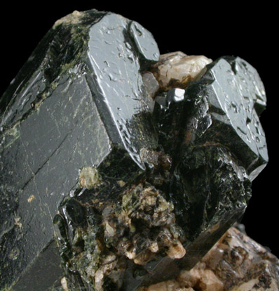 | Description: | Lustrous black clinopyroxene crystals (see Rocks and Minerals v.13 #2) up to 32 mm long with translucent limonite-stained microcline crystals up to 16 mm long and slender hexagonal apatite crystals to 8 mm long. One corner of the main crystal is chipped. Ex. Steve Chamberlain collection #5968; ex. Thurstons in 1983 |