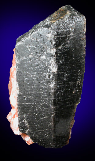 | Description: | Terminated dark gray (with faint purple tint) apatite crystal with orange calcite matrix attached along one side. Ex. Steve Chamberlain collection #4564; collected by George Robinson (1946-2024) in 1980 |