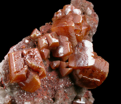 | Description: | Orange-brown lustrous wulfenite crystals up to 9 mm wide on limonite gossan with white calcite crystals up to 3 mm. The outer zones of the wulfenite crystals are translucent, the central layer is transparent. |