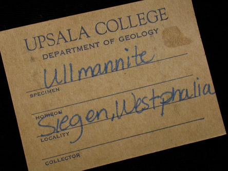 | Description: | Pewter-colored metallic ullmannite crystals in a dense, compact crystalline mass with old label from Upsala College. Ex. Upsala College |