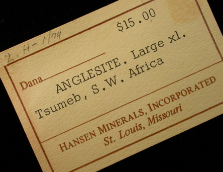 | Description: | Transparent colorless anglesite crystal with a second partial crystal intersecting near the bottom. The anglesite crystal has lustrous, striated crystal faces and remnants of matrix in two spots. Ex. Gary Hansen in 1979 |