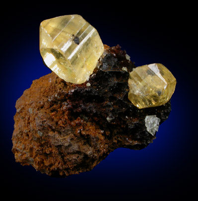 | Description: | Two transparent yellow anglesite crystals on limonite gossan. The crystal on the left had popped off the matrix and was restored into position with glue. |