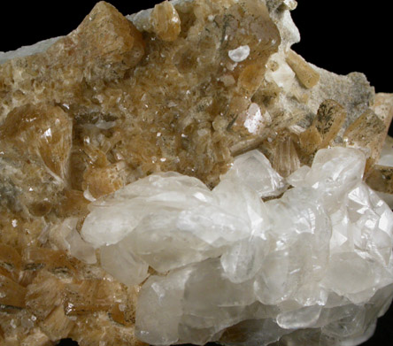 | Description: | Translucent brown stilbite crystals up to 6 mm long in classic wheat-sheaf-shaped aggregates with complex crystals of translucent colorless calcite up to 11 mm across. |