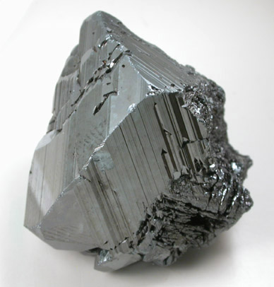 | Description: | Old-time specimen of large crystals of dark metallic hematite with no matrix attached. The crystal faces show sharp striations and have mirror-like luster. The edges are worn throughout the specimen, but the surface luster is very showy. |