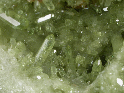 | Description: | Sparkling cluster of lustrous green vesuvianite crystals lining complex cavities on front and rear of the specimen. The vesuvianite crystals vary from stubby to elongated prisms with pyramidal terminations. This specimen is one of the best from this lot. |