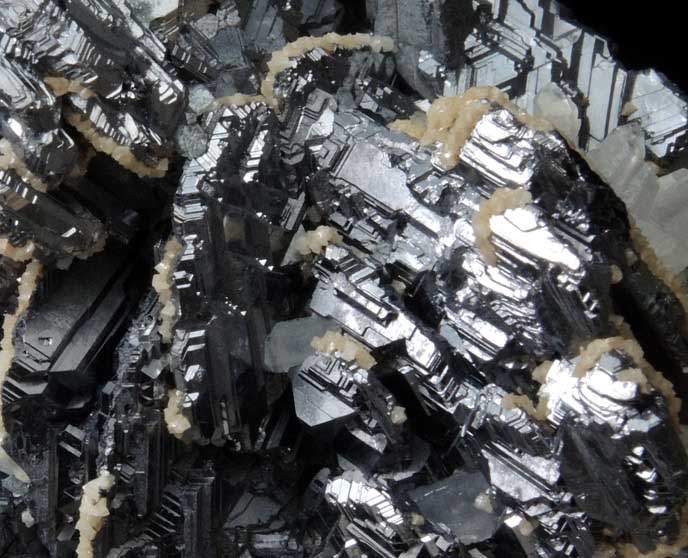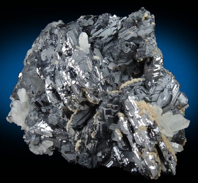 | Description: | Bright metallic galena crystals to 9 mm twinned following the Spinel Law of isometric twinning forming flattened aggregates up to 30 mm across with translucent colorless quartz crystals up to 9 mm long and tan calcite microcrystals. |