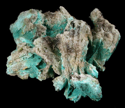 | Description: | Translucent gray cerussite pseudomorphs after bladed hemimorphite crystals up to 22 mm long with blue-green aurichalcite microcrystals on the surfaces. Several areas of the cerussite exhibit complex twinning typical of that species. |