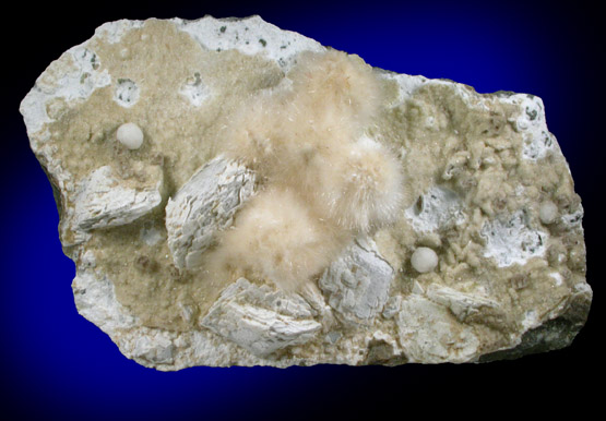 | Description: | Radiating hair-like white okenite crystals in aggregates to 15 mm diameter with spherical white gyrolite aggregates to 5 mm diameter and small pseudocubic transparent calcite crystals up to 3 mm with brown internal zones plus large rhombic white pseudos. |