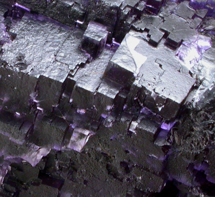 | Description: | Complexly crystallized translucent purple fluorite crystals up to 40 mm across with surfaces composed of many smaller parallel 1-15 mm crystal faces. When rear-illuminated the fluorite shows internal color zoning. |