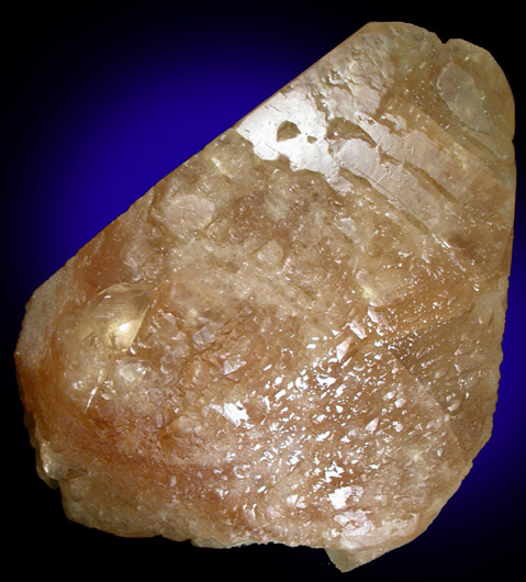 | Description: | Large doubly-terminated scalenohedral golden calcite crystal with minor pyrite-chalcopyrite included in the bottom where it was attached to matrix. The calcite crystal is translucent and has complex surfaces composed of smaller parallel crystal faces. Ex. Steve Chamberlain collection #4200; originally acquired in 1977; ex. Laviere collection #200 |