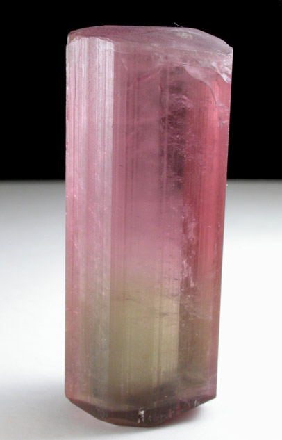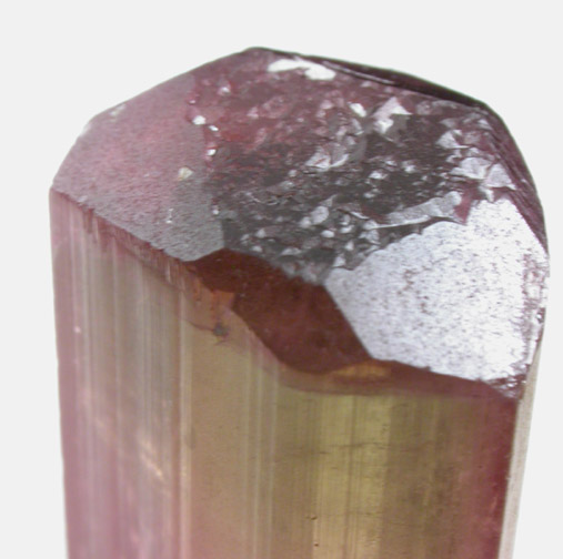 | Description: | Transparent doubly-terminated bi-colored elbaite tourmaline crystal with complex terminations of the basal pinacoid modified by shallow secondary faces. The tourmaline crystal is half pink and half green with good internal clarity. |