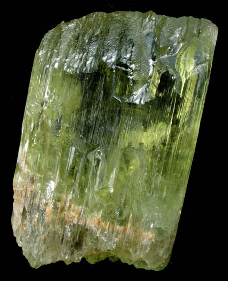 | Description: | Doubly-terminated yellow-green spodumene crystal with striated prism faces and complex terminations composed of many smaller, parallel termination faces. Internally the spodumene is highly transparent and the upper half is flawless, gem-grade. |