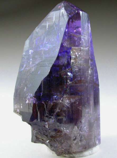 | Description: | Lustrous transparent tanzanite crystal, the trichroic blue-violet gem variety of the mineral species zoisite, fully crystallized on all faces. The termination end is gemmy and shows color change when rotated. The lower half has gray graphite inclusions. Weight: 54 carats |