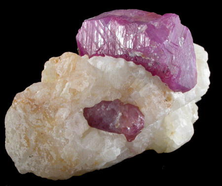 | Description: | Two translucent ruby crystals, the pink gem variety of the mineral species corundum, embedded in yellowish marble. The largest crystal is nicely exposed on the top edge and shows striated crystal faces throughout except on the rear where it is incomplete |