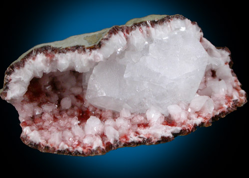 | Description: | Elongated pocket lined with colorless heulandite crystals to 3 mm with red hematite inclusions on the bases of the crystals and a large colorless transparent apophyllite crystal group in the center. The color contrast makes this an aesthetic miniature. |