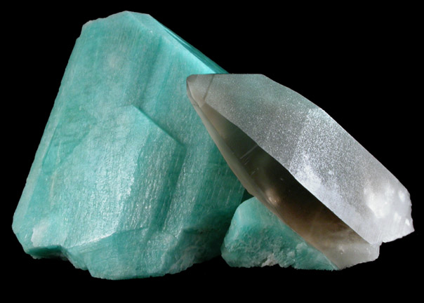 | Description: | Blue-green amazonite crystals, the lead-rich variety of the mineral species microcline, up to 35 mm long with transparent dark-smoky quartz crystals up to 35 mm long. The cluster is complete all around, though was repaired in one place. |