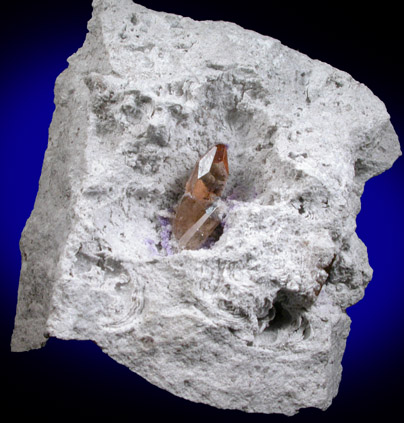 | Description: | Pristine crystal of flawless golden sherry-colored topaz nestled in a small cavity in gray rhyolite surrounded by purple fluorite microcrystals. Matrix specimens of topaz rare because the topaz commonly cleaves during extraction of the specimen. |