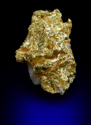 | Description: | Bright metallic native gold crystalline mass on milky quartz matrix. Under magnification small crude crystal faces are visible throughout the gold. |