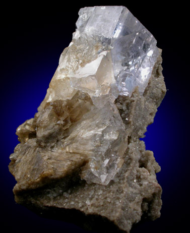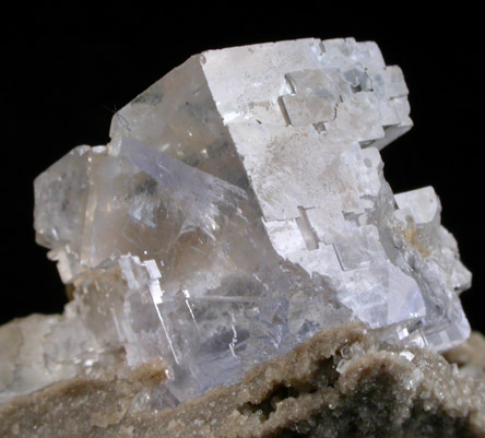 | Description: | Transparent glassy pale-blue cubic fluorite crystal on brown limestone matrix with minor dolomite and calcite. The pocket pinched down to the left resulting in incomplete development of the fluorite crystals on that side. (From Penfield or Walworth Q.) Ex. Chas. W. Velte Jr. (1914-1987) collection #874 |