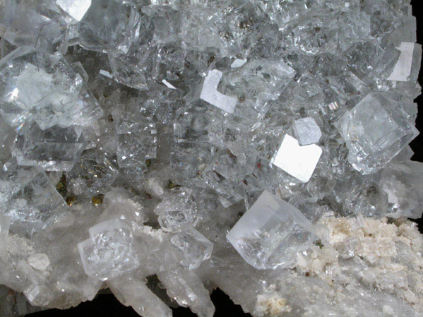| Description: | Transparent (water-clear) pale-green cubic fluorite crystals to 10 mm across on thin plate of pyrite-quartz matrix. |