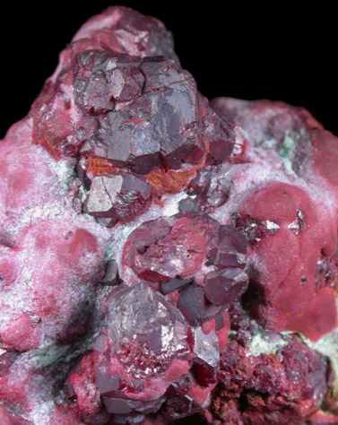 | Description: | Sharp cubo-octahedral red-black cuprite crystals up to 3.5 mm across mixed with botryoidal violet-colored cuprite microcrystals over arborescent native copper. Ex. Chas. W. Velte Jr. (1914-1987) collection #57 |