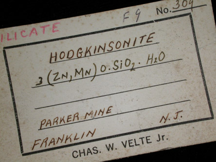 | Locality: | Parker Shaft, Franklin, Sussex County, New Jersey (Type Locality for Hodgkinsonite and Franklinite) |