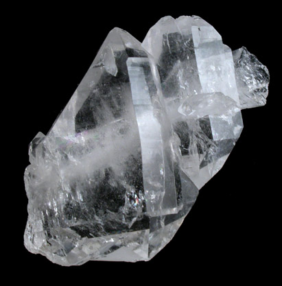 | Description: | Faden-habit quartz: doubly-terminated colorless quartz crystals that grew out from a milky center seed zone, known as the sucre (sugar). All surfaces are fully crystallized except attachment points on top and bottom. |