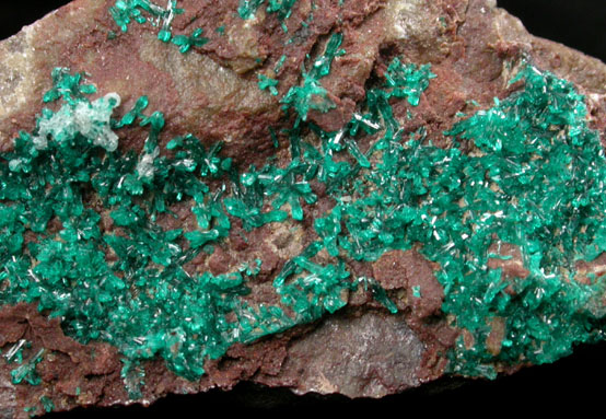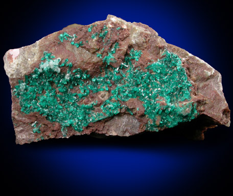 | Description: | Vivid green dioptase microcrystals coating one face of gray matrix. A colorful dioptase specimen from this noted locality that has not been worked for 25 years. Ex. Chas. W. Velte Jr. (1914-1987) |