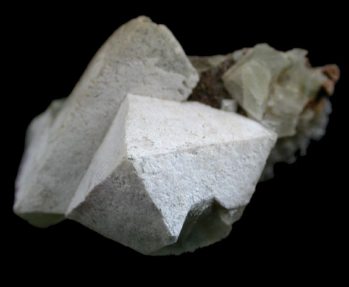 | Description: | Octahedral translucent green fluorite crystals with minor matrix on one edge. The surfaces have etched, matte luster with white coating, possibly of quartz. Ex. Chas. W. Velte Jr. (1914-1987); collected November 1979 |