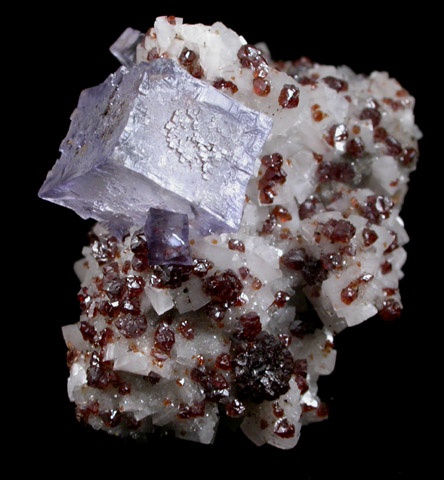 | Description: | Floater specimen of a 12 mm transparent purple cubic fluorite crystal on saddle-shaped colorless dolomite crystals to 4 mm with transparent brown sphalerite crystals to 4 mm. Note the fluorite crystal has concave cubic faces that exaggerate the edges. |