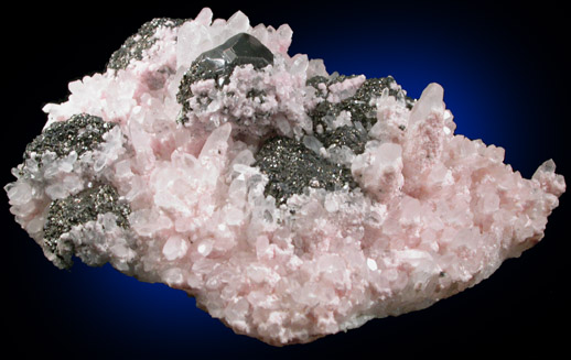 | Description: | Translucent pink rhodochrosite microcrystals overgrown on colorless quartz crystals up to 14 mm long with dark metallic sphalerite crystals up to 10 mm. |