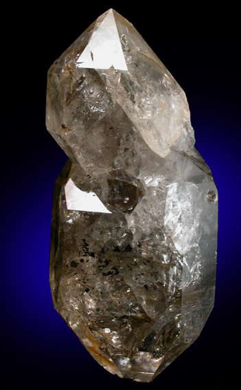 | Description: | Two interconnected parallel Herkimer Diamonds, a variety of quartz crystals, with no matrix attached. Black carbon inclusions, locally called anthraxolite, are scattered throughout the fractured interior. |