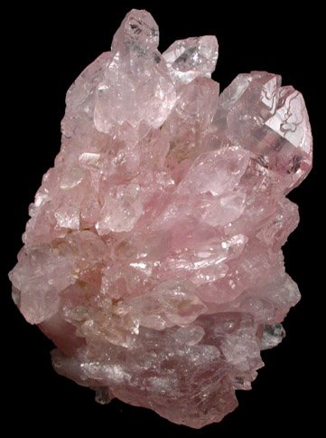 | Description: | Lustrous transparent pink rose quartz crystals in a cluster fully crystallized on all sides. These rose quartz crystals are larger and have better transparency than most specimens available. Rose quartz crystals are rare and occur at few localities. |