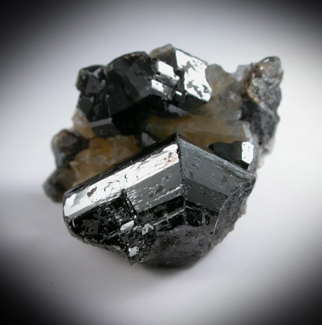 | Description: | Large crystals of lustrous black cassiterite to 15 mm across with translucent quartz crystals to 5 mm running through the middle. Many of the cassiterite crystals are twinned. The bottom was sawn to remove excess matrix without damage. |