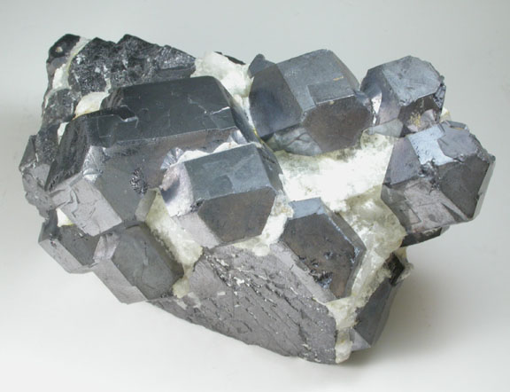 | Description: | Rectangular metallic galena crystal 80 mm across with three faces overgrown with smaller cubo-octahedral galena crystals to 40 mm plus remnants of white calcite in areas. The smaller galena crystals appear to be at 45° to the underlying large crystal. |